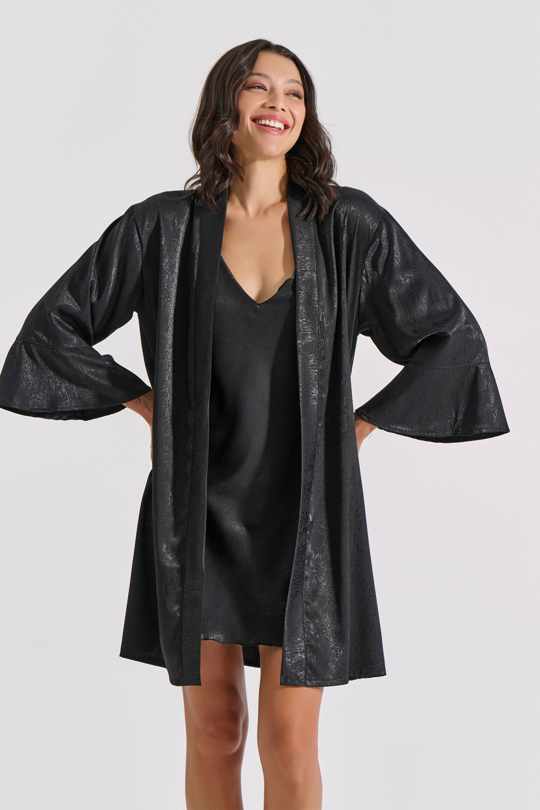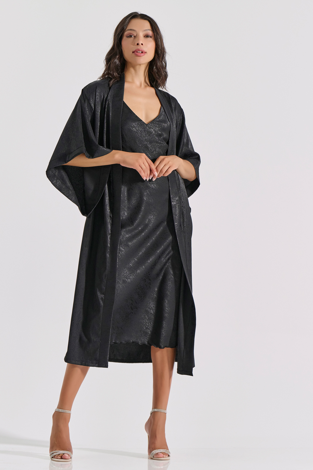 Σετ Εσωρούχων Μάξι Νυχτικό + Κιμονό Σατέν Ζακάρ – Μαύρο – MilenaByParis