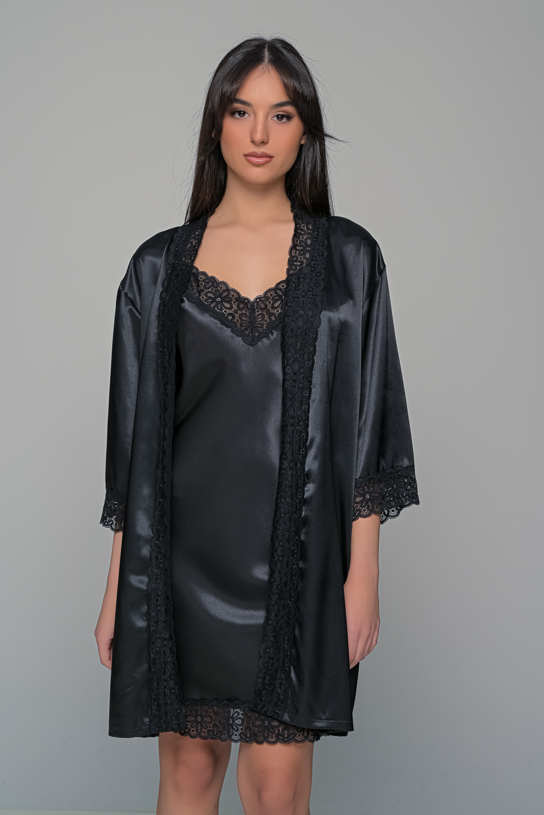 Σατέν Ρόμπα Με Δαντέλα – Μαύρο – Milenabyparis