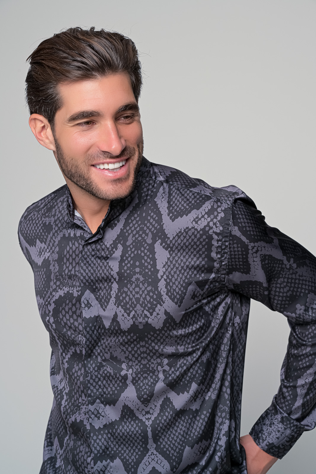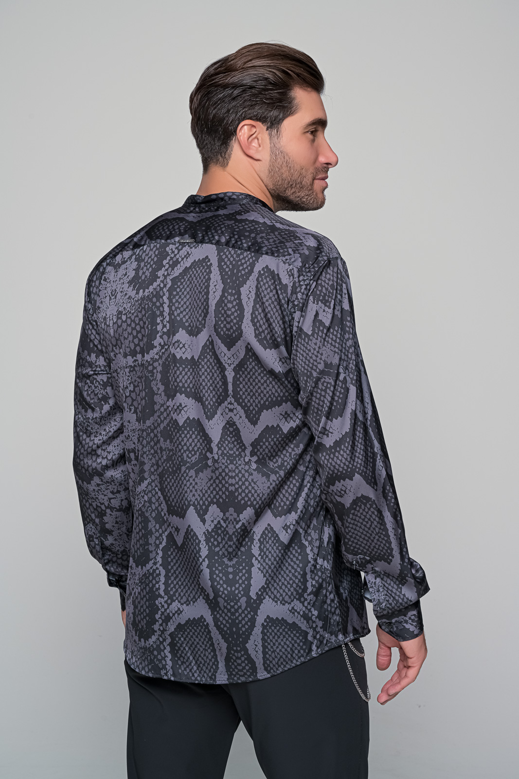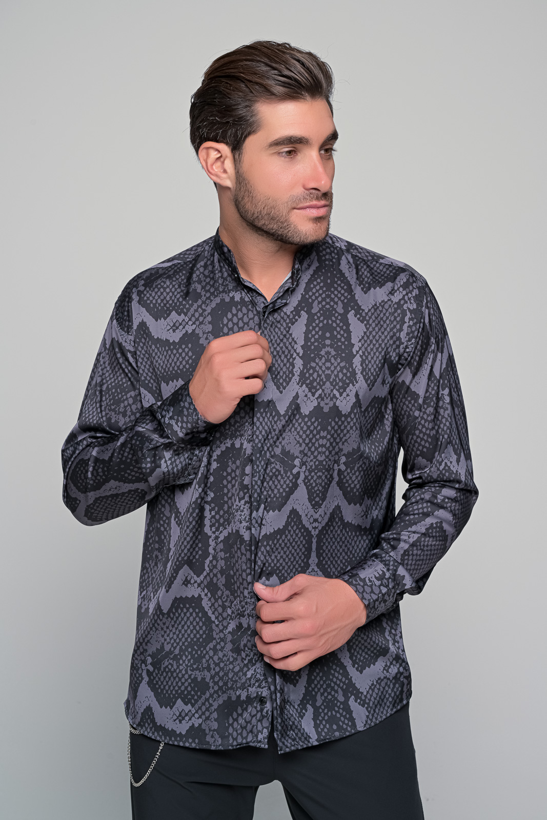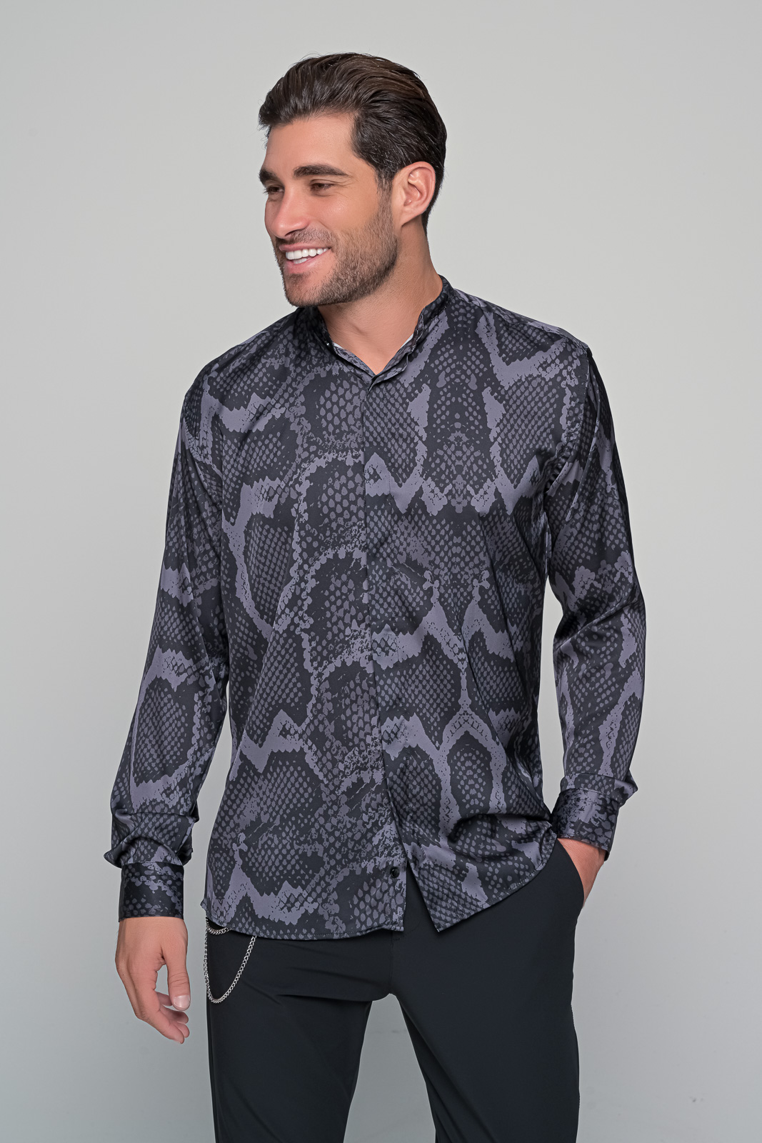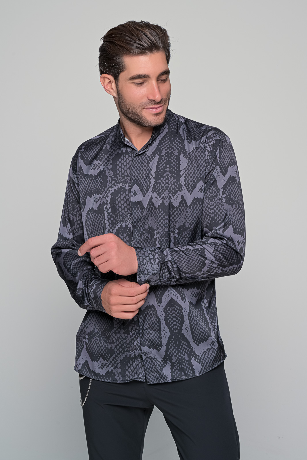 satin serenade ανδρικό πουκάμισο από την εταιρεία ben tailor – Συλλογή velluto nero Κύρια χαρακτηριστικά: Υλικό: Ποιοτικό σατέν για μια λαμπερή και απαλή αίσθηση. Τύπωμα: Μοναδικό ψηφιακό τύπωμα με μαύρο και γκρι snake πριντ. Πατιλέτα: Κρυφή για μια κομψή και καθαρή εμφάνιση. Γιακάς: Μαο γιακάς που προσφέρει μια σύγχρονη και εκλεπτυσμένη πινελιά. Σχεδιασμός: Διακριτικό και κομψό| ιδανικό για επίσημες ή casual εμφανίσεις. Περιγραφή: Το satin serenade είναι το απόλυτο πουκάμισο για τον σύγχρονο άνδρα που επιθυμεί να ξεχωρίζει. Από την εκλεκτή συλλογή velluto nero της εταιρείας ben tailor| αυτό το πουκάμισο ενσωματώνει την πολυτέλεια του σατενέ υφάσματος με την τολμηρότητα του μαύρου και γκρι snake πριντ. Η κρυφή πατιλέτα προσθέτει μια νότα μυστηρίου| ενώ ο μαο γιακάς τονίζει την προσοχή στις λεπτομέρειες. Ανεξάρτητα από την περίσταση| το satin serenade θα σας προσφέρει μια αξέχαστη εμφάνιση.97% micro saten 3% lycra
