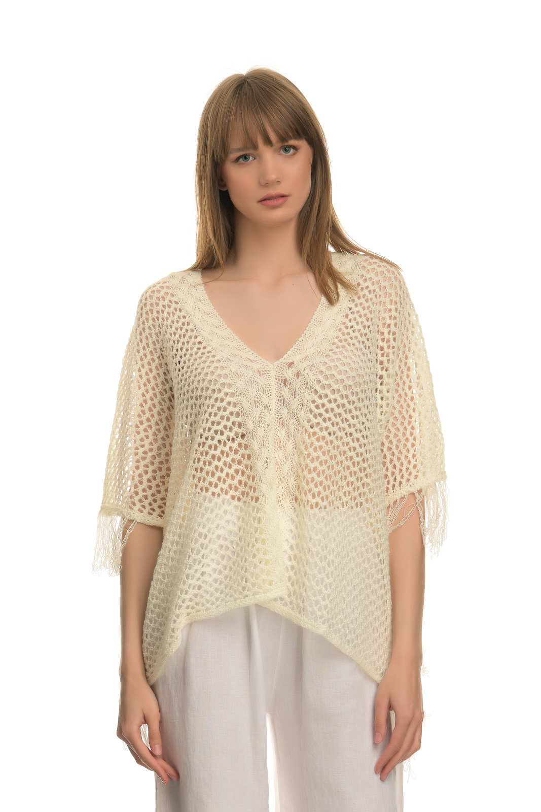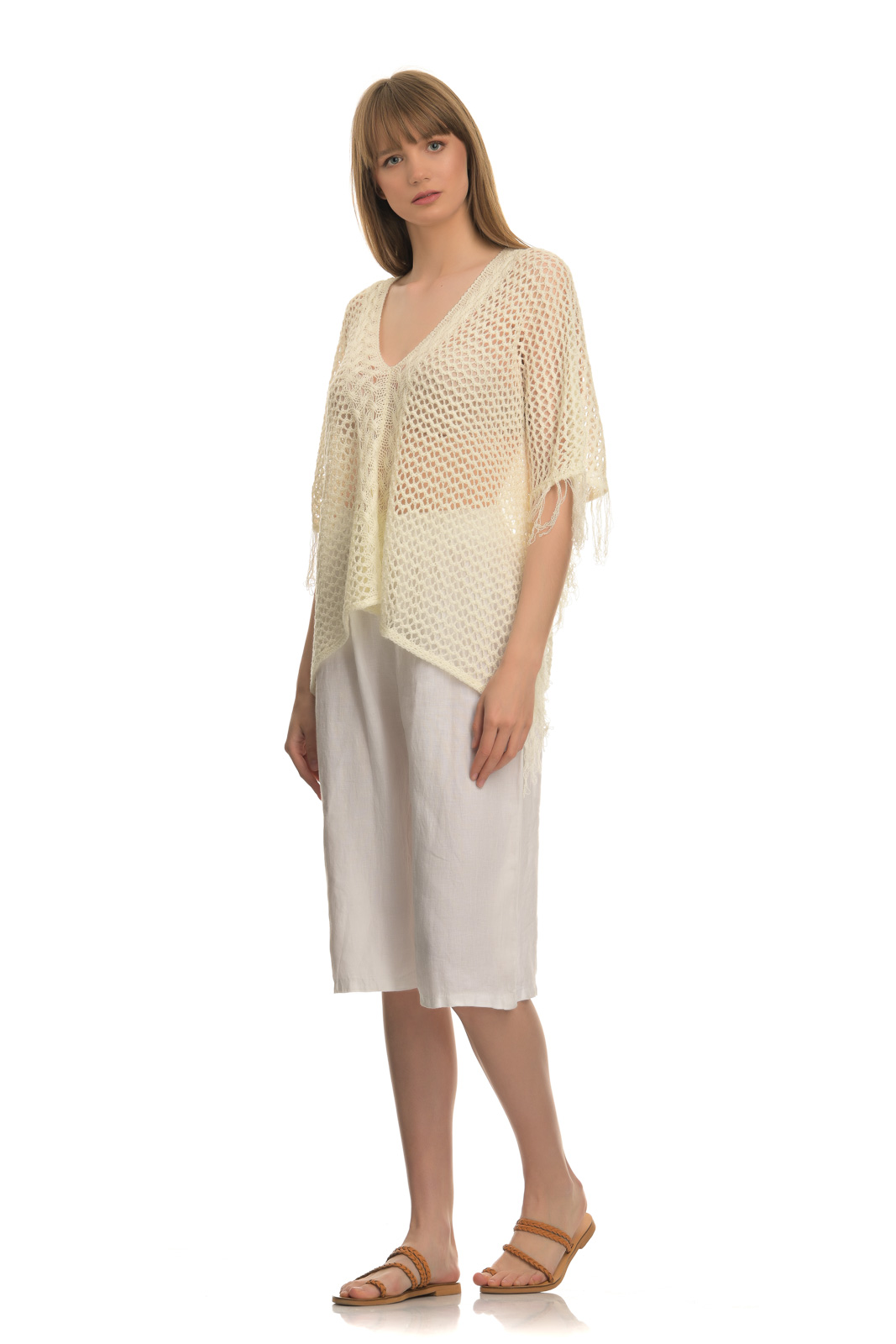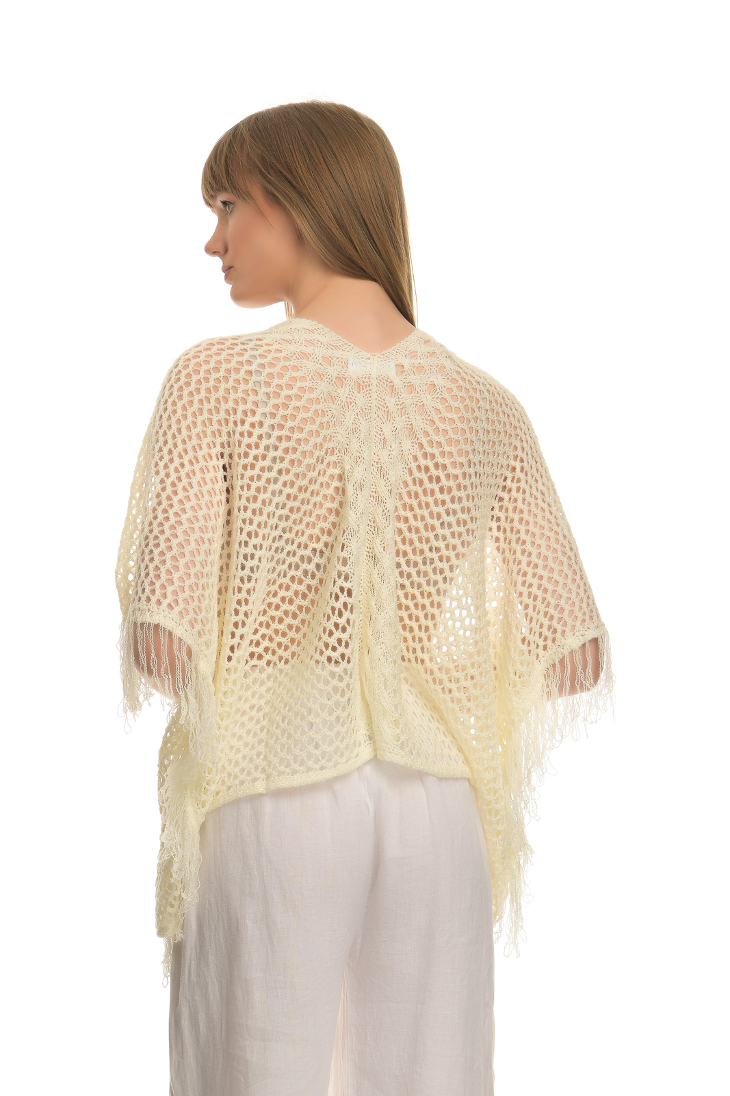 Απαλό κίτρινο crop – top καφτάνι με λεπτά ξέφτια. Πέφτει χυτά στη περιοχή του ντεκολτέ και είναι διάτρητο χωρίς εσωτερική φόδρα.