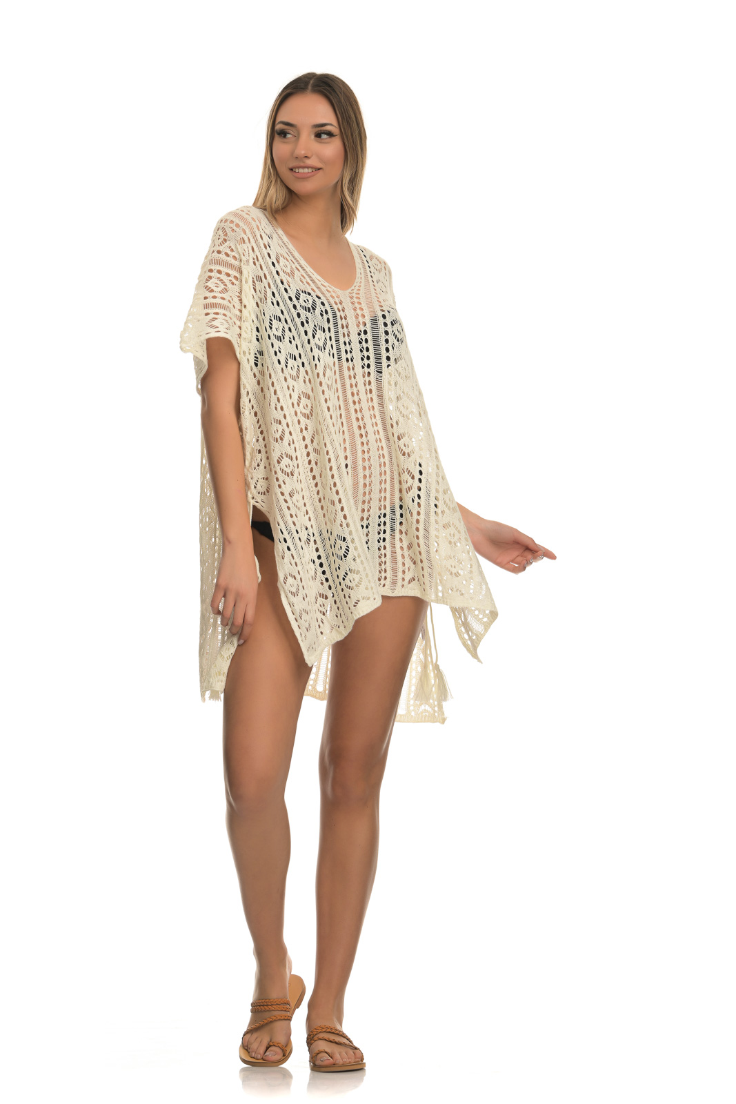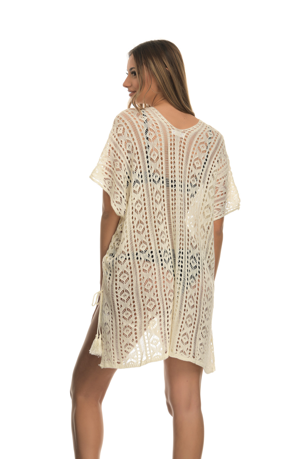 Μπεζ κοντομάνικο καφτάνι με V στο ντεκολτέ, διάτρητο με μοτίβα, μίνι και με μικρά δεσίματα στο πλάι για να σουρώνει.