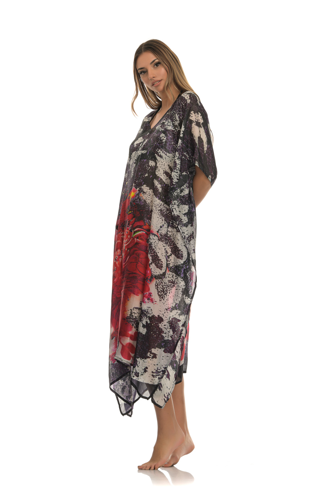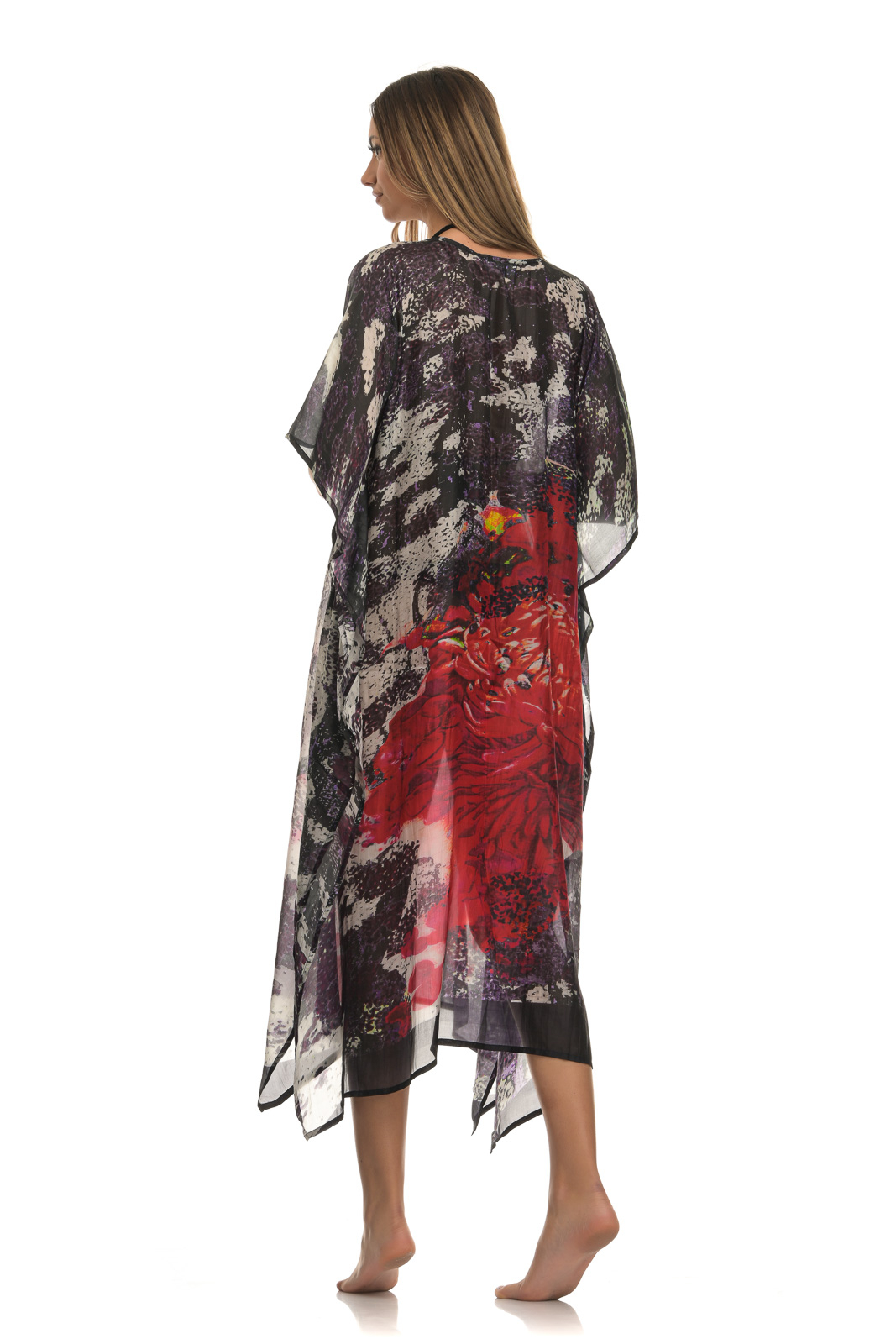 Πολύχρωμο ασύμμετρο καφτάνι με print ένα λουλούδι σε απόχρωση κόκκινο. Το μανίκι φτάνει μέχρι τον αγκώνα ενώ έχει χαμηλό V και σκούρους χρωματισμούς. Συνδυάζεται από μια καθημερινή casual εμφάνιση πόλης, μέχρι την παραλία, αλλά και μια χαλαρή βραδινή έξοδο.