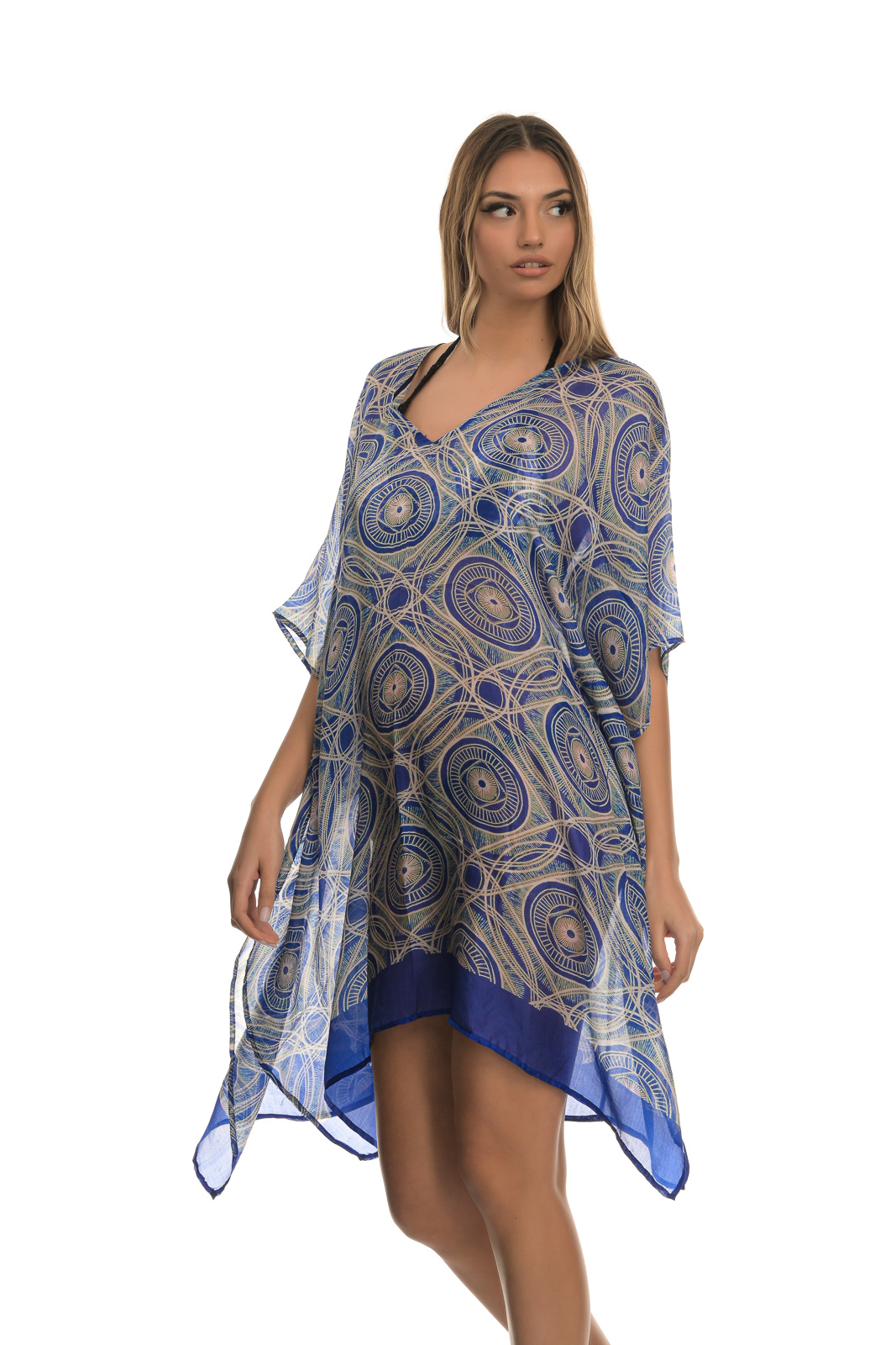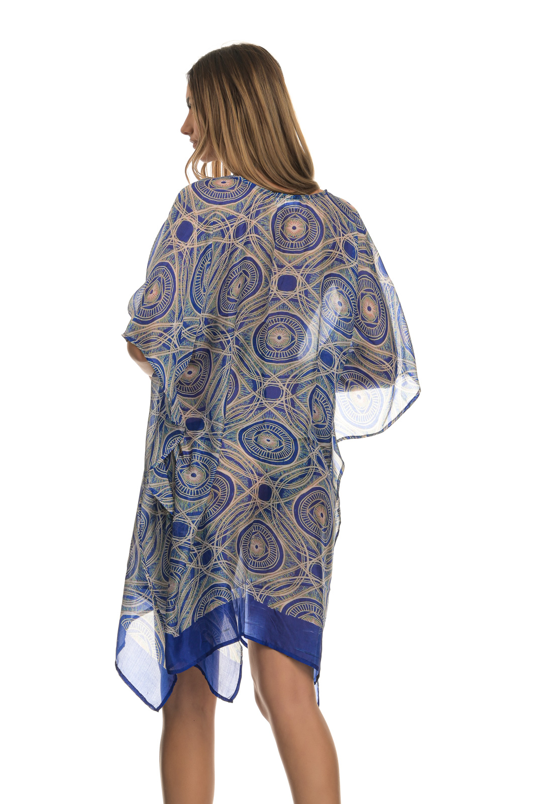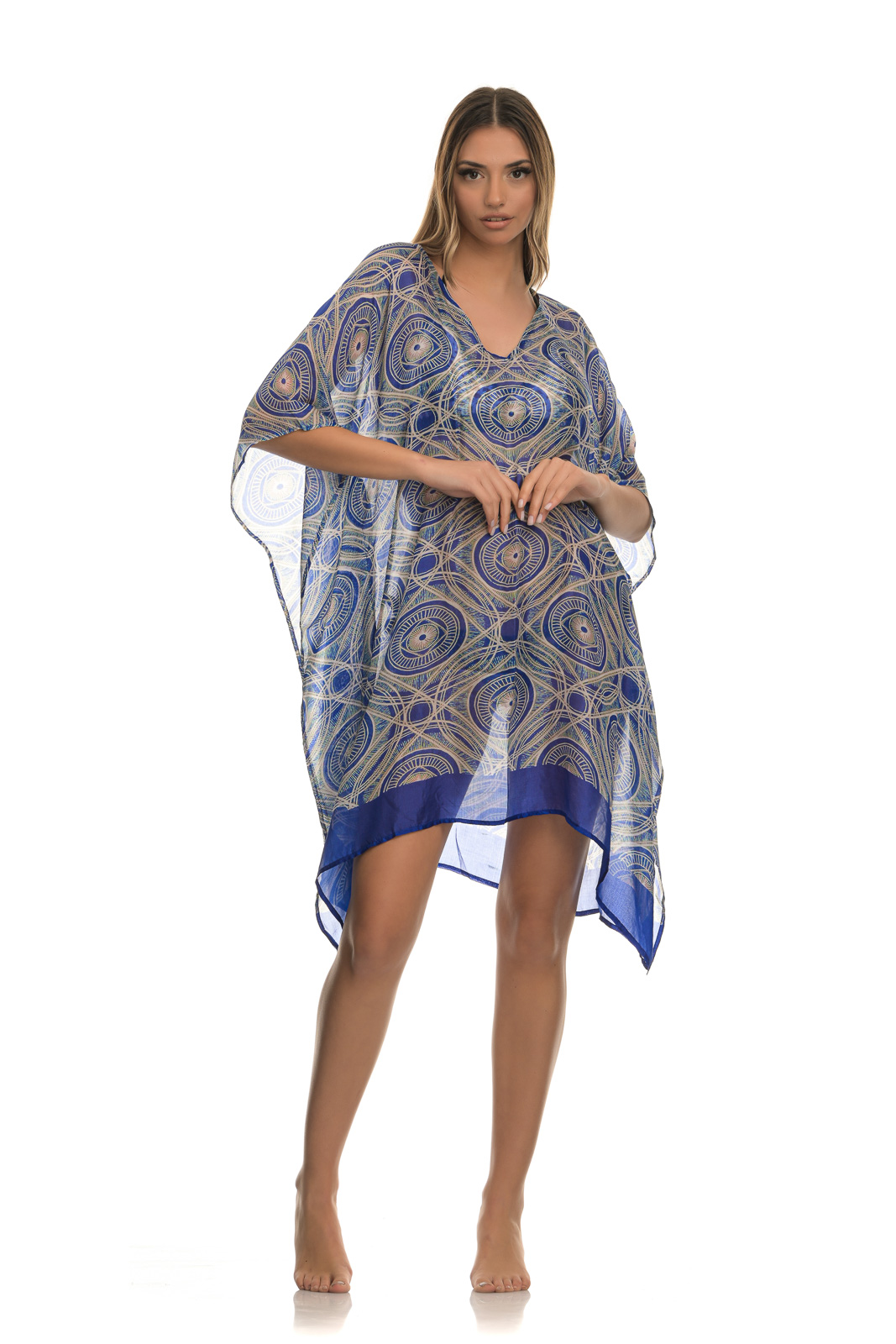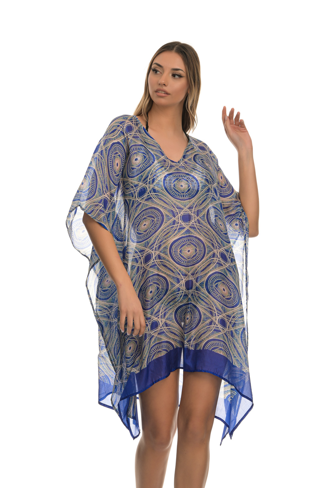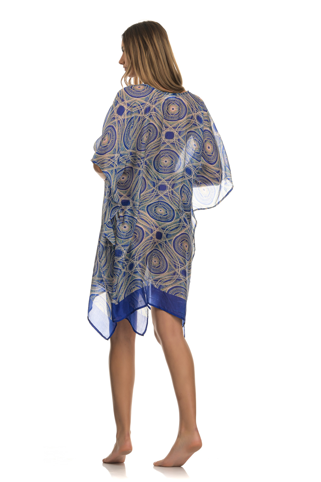 Πολύχρωμο διαφανές χυτό μίνι καφτάνι, με σχέδια μπλε – μπεζ και μανίκι μέχρι τον αγκώνα, που συνδυάζεται από μια καθημερινή casual εμφάνιση πόλης, μέχρι την παραλία, αλλά και μια χαλαρή βραδινή έξοδο.