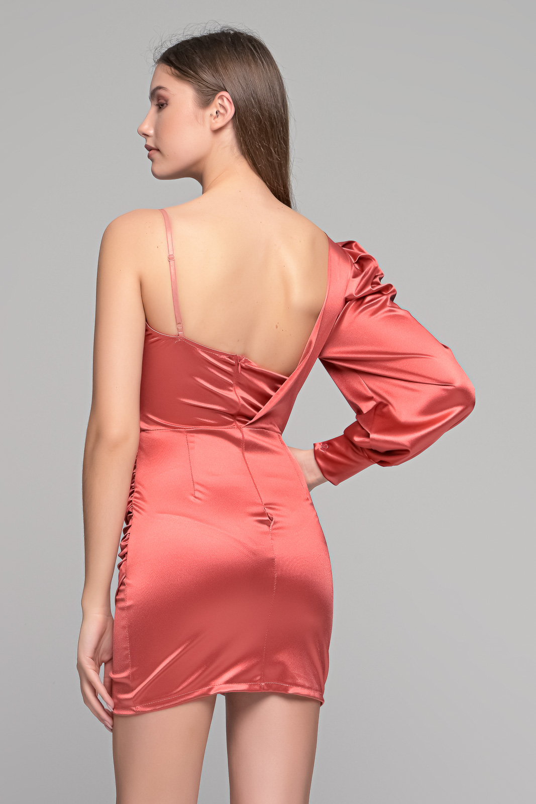 Μίνι μεταλιζέ ροδακινί φόρεμα με έναν ώμο και μουσκωτό μανίκι. Στον έναν ώμο έχει λεπτή ρυθμιζόμενη τιράντα, ενώ στο άλλο χέρι έχει μακρύ μανίκι που καταλήγει σε διακριτικά κουμπιά. Απαλό ύφασμα με διακριτικά cups στο στήθος. Εφαρμοστό, με σούρα στο πλάι της μέσης, που καταλήγει σε ενα σκίσιμο χαμηλά στο μηρό.