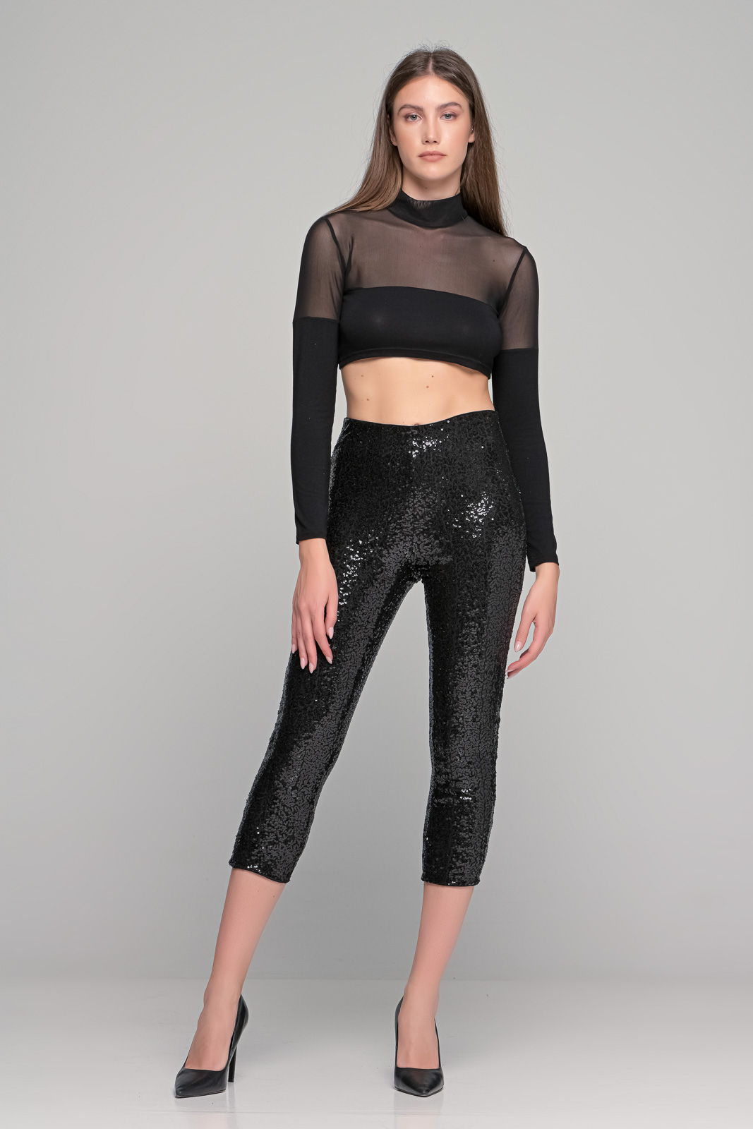 Μαύρο με διαφάνειες μπουστάκι. Λαιμόκοψη εφαρμοστή στο λαιμό, διαφάνεια στο ξεκίνημα του ντεκολτέ. Διαφάνειες και στα μανίκια στο σημείο του μπράτσου.