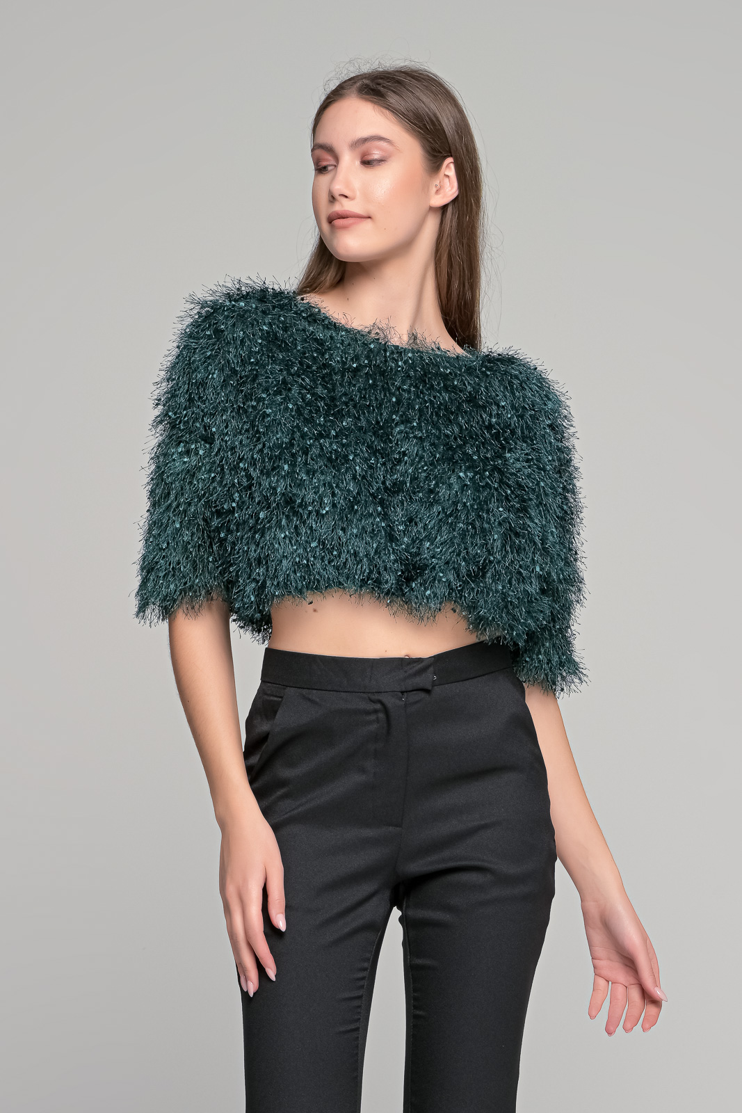 Κυπαρισσί loose μπλούζα κοντομάνικη με αφή φλοκάτης, ασορτί λεπτά κρόσια και εσωτερική ύφανση . Άνετη εφαρμογή και λαιμόκοψη σε σχήμα χαμόγελου.