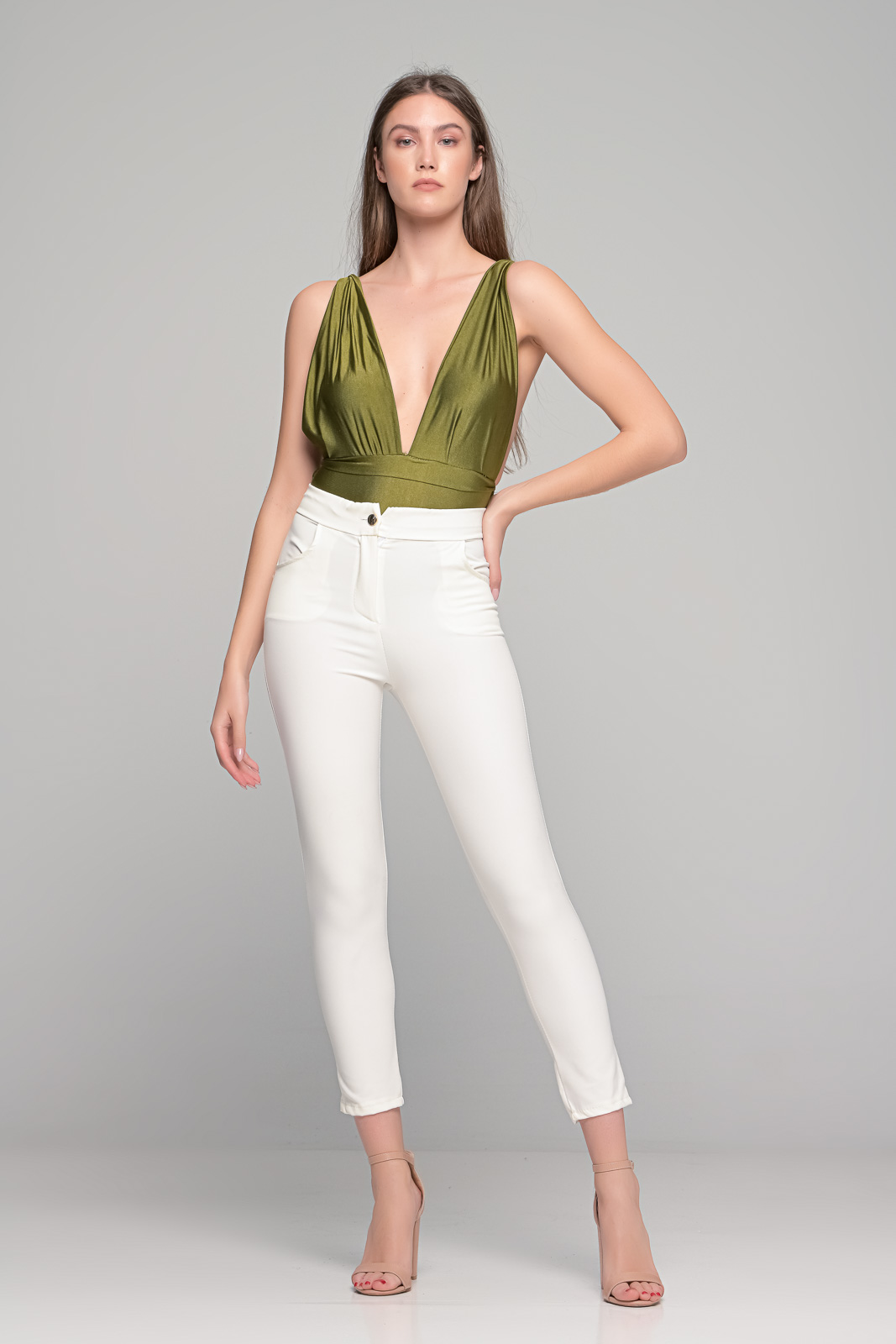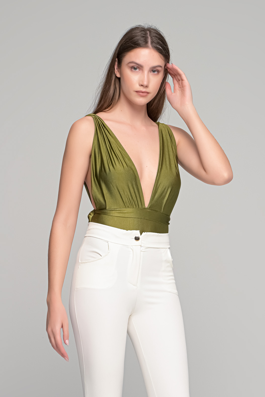 Λαδί κορμάκι σατέν μεταλιζέ με σούρες, πέφτει χαλαρά στο στήθος. Με ακάλυπτους ώμους και λάστιχο κάτω απο το ντεκολτέ
