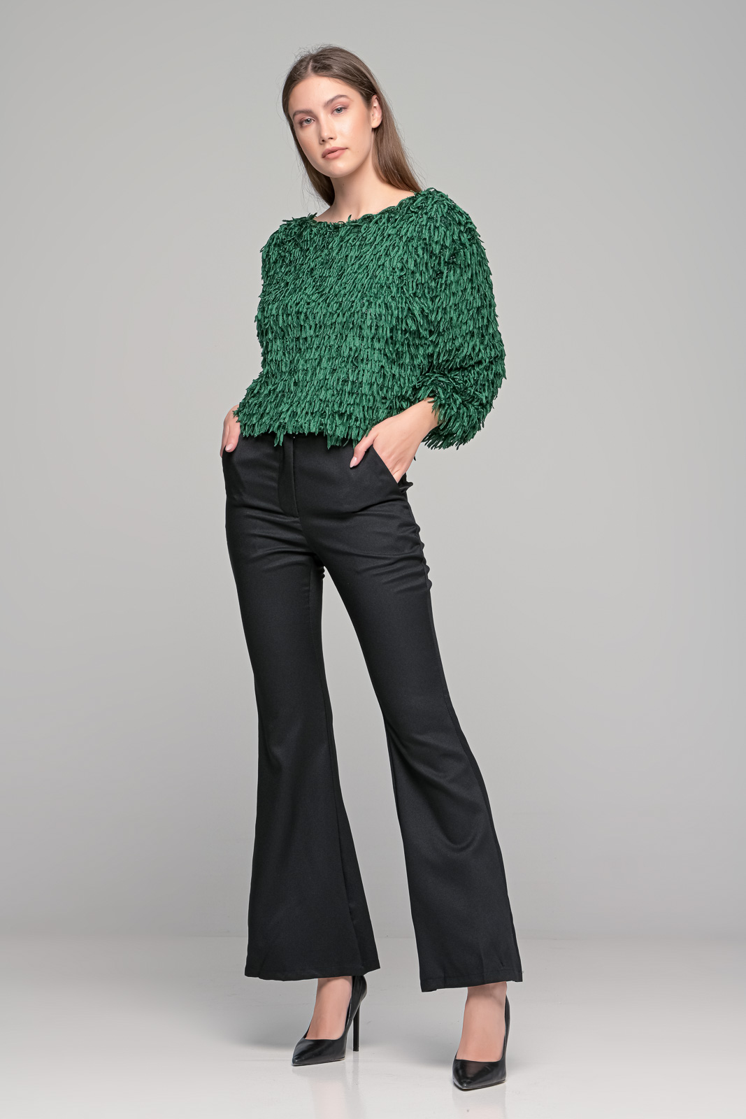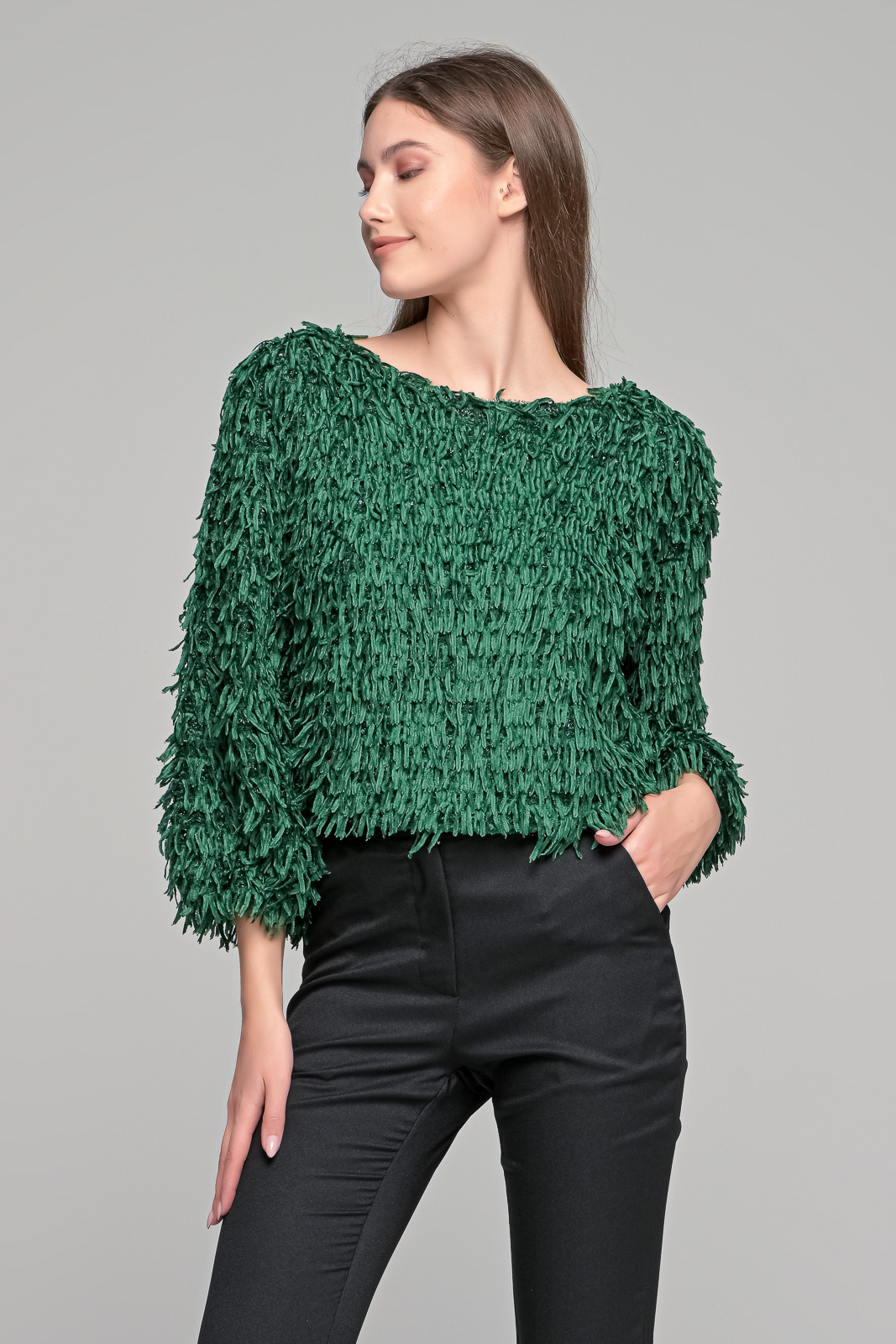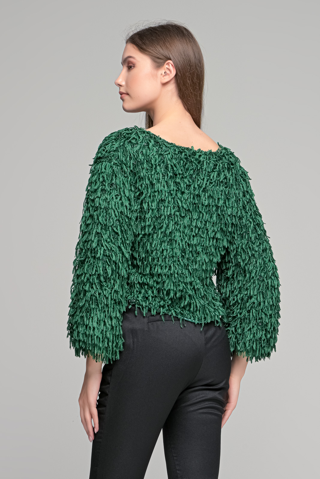 Κυπαρισσί loose μπλούζα μακρυμάνικη fluffy, ασορτί φαρδιά κρόσια και εσωτερική ύφανση . Άνετη εφαρμογή και λαιμόκοψη σε σχήμα χαμόγελου. Γυαλιστερές κυπαρισσί υφάνσεις.